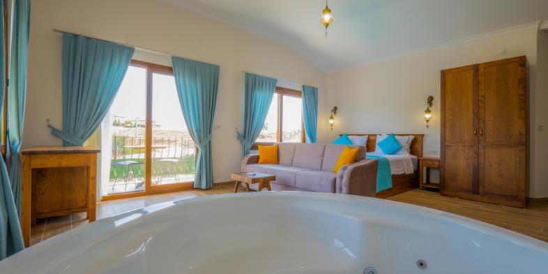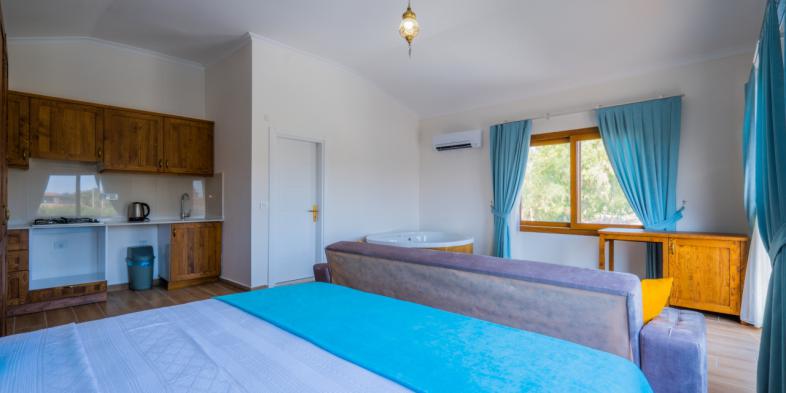 1 Adet King size çift kişilik yatak(280*300), Elbise dolabı, Makyaj masası, Jakuzi, Çekyat, Buzdolabı, Mutfak, Klima, Ensuit banyo ve Geniş Balkonda masa ve sandalye takımı bulunmaktadır.