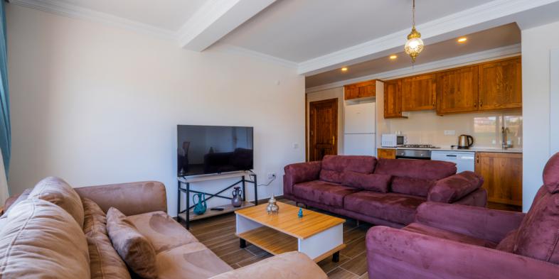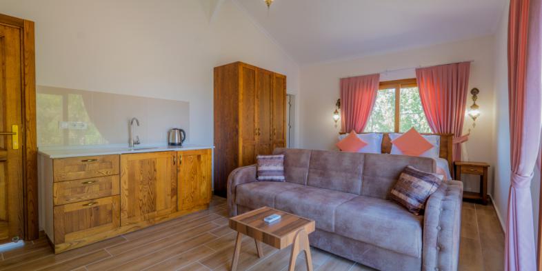 Konforlu oturma grubu, orta sehpa, 49 inç android TV, Klima ve Wİ-Fİ bulunmaktadır. Ortak Kullanım WC ve Banyo mevcuttur.
