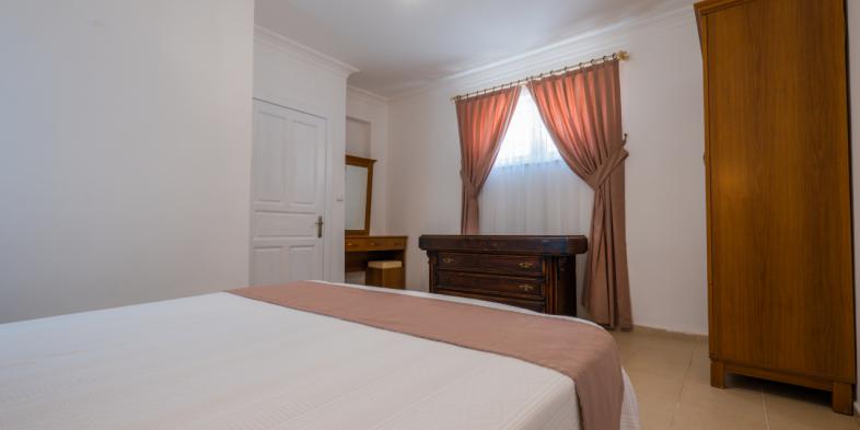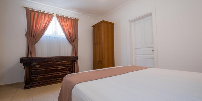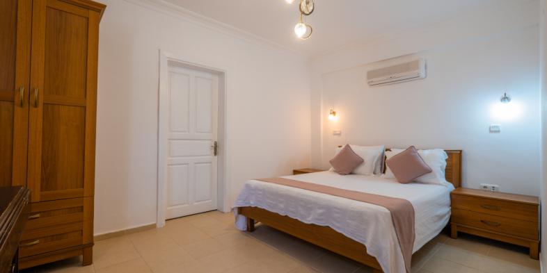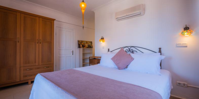 1 Adet King size çift kişilik yatak,Komidin, Elbise dolabı, Makyaj masası ve Klima bulunmaktadır.