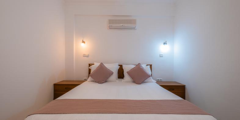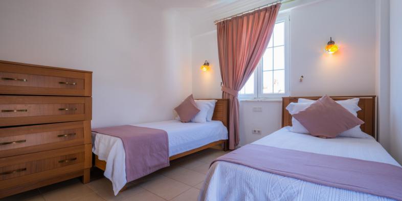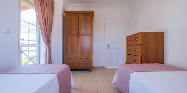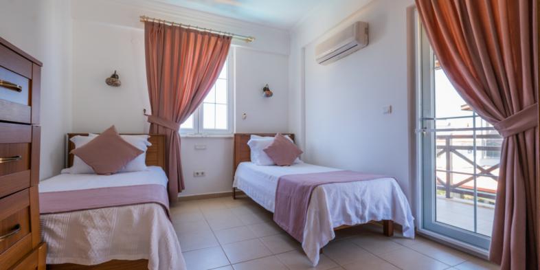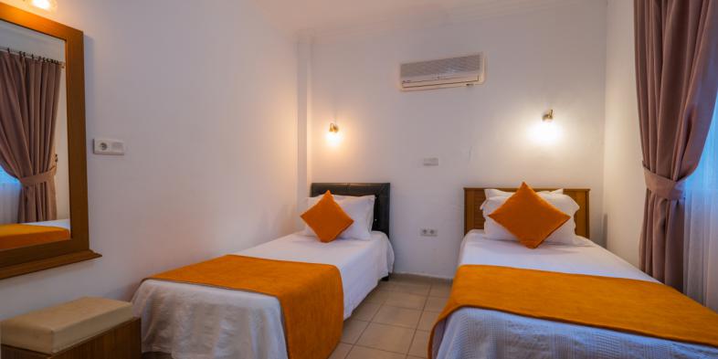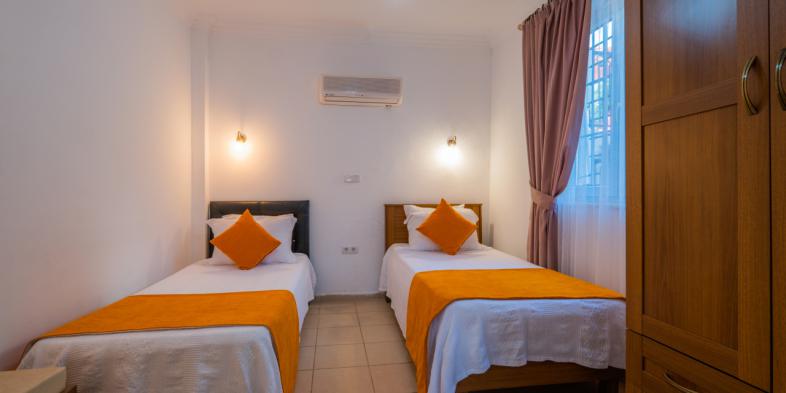 2 Adet tek kişilik yatak, Elbise dolabı, Klima, Banyo-WC ve balkon bulunmaktadır.