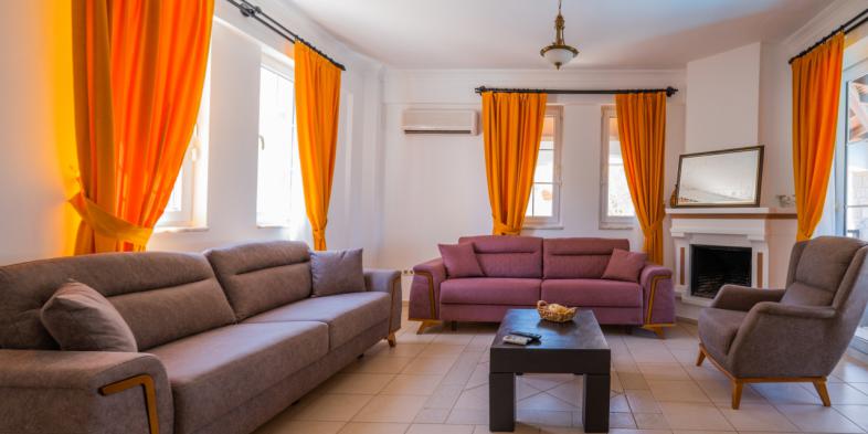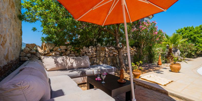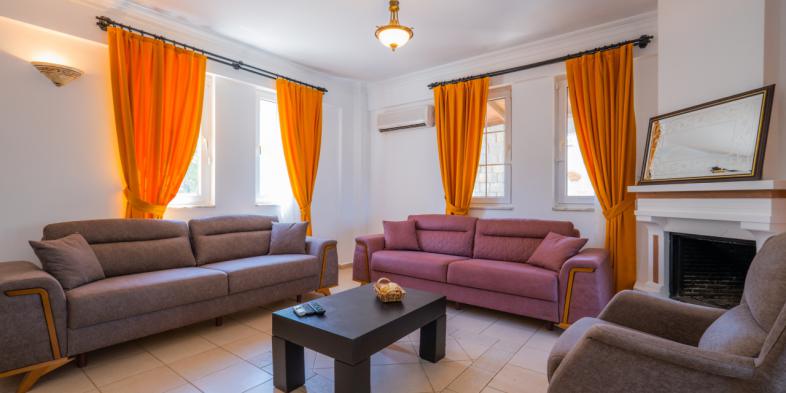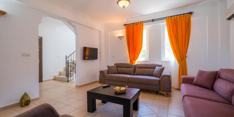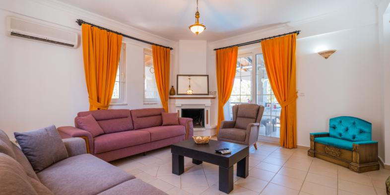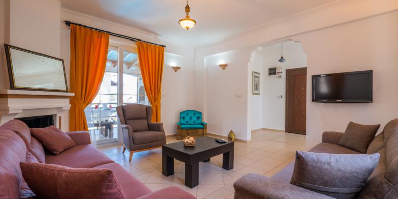Konforlu oturma grubu TV, Klima, Şömine, Wİ-Fİ bulunmaktadır. Balkonda taş mangal,çamaşır kurutma askısı ve 8 kişilik masa sandalye takımı bulunmaktadır. Balkondan bahçeye geçiş vardır.