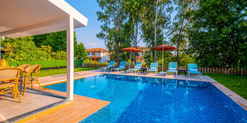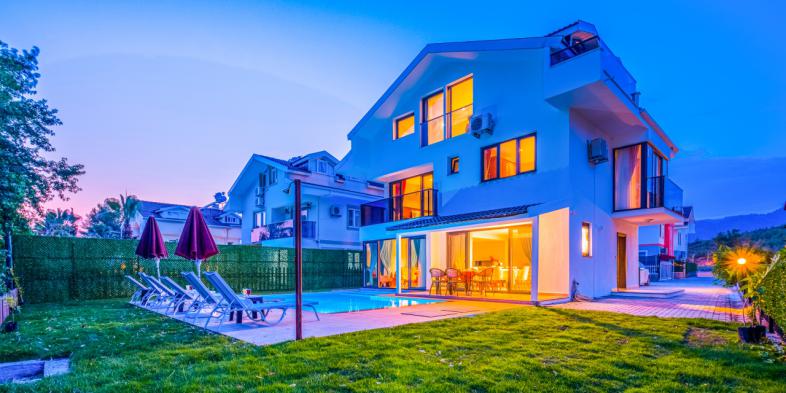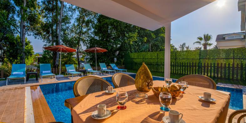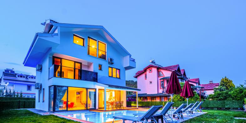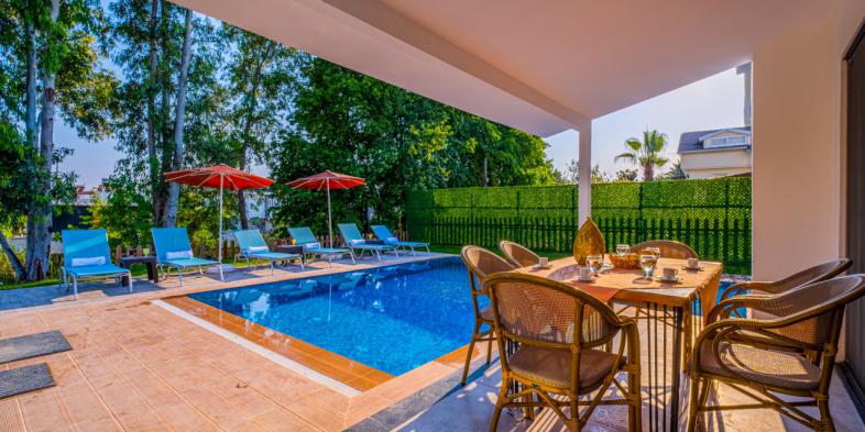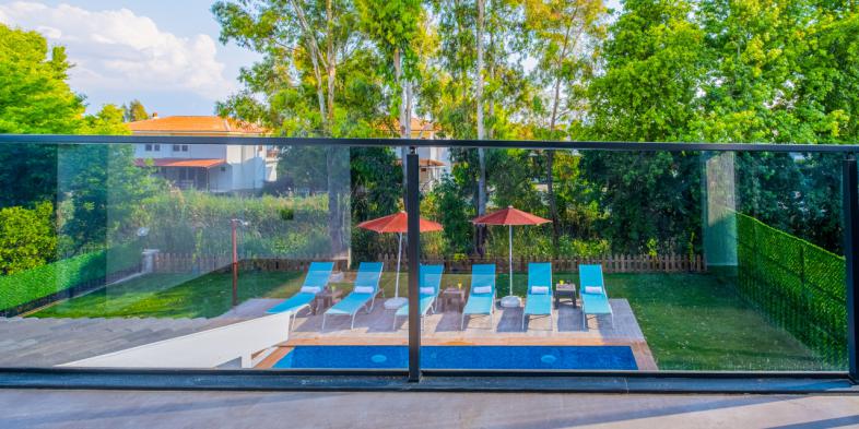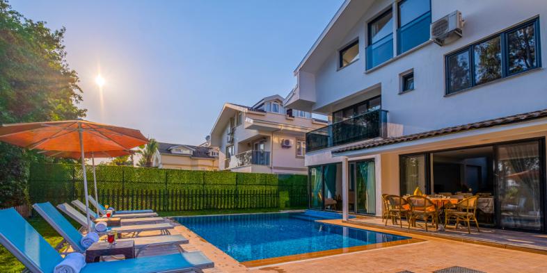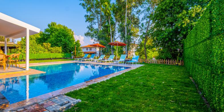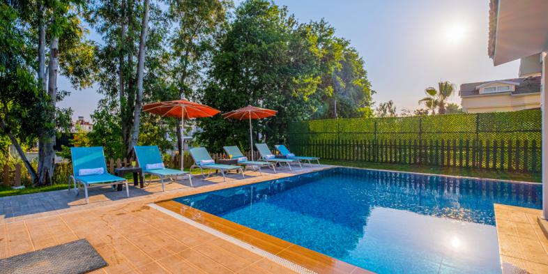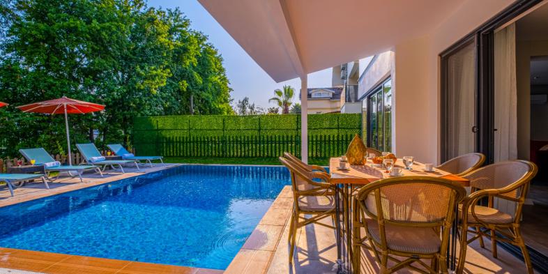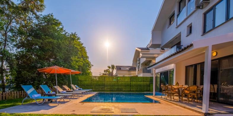 Our villa which is suitable for crowded families with its location in the lush nature, offers a wonderful holiday opportunity. In the evening you will experience a pleasant atmosphere both in and around the villas. Although they are isolated in an exclusive little enclave, the outdoor lightning creates harmony between the villas, making the area a lovely spot to go for a walk in the evening. You private pool will be lit at night.