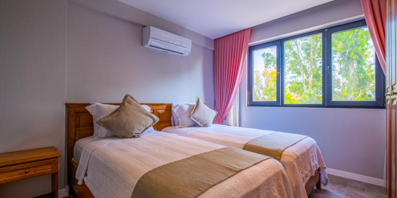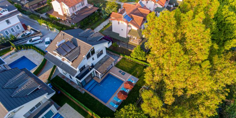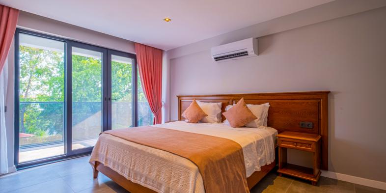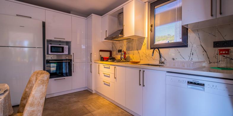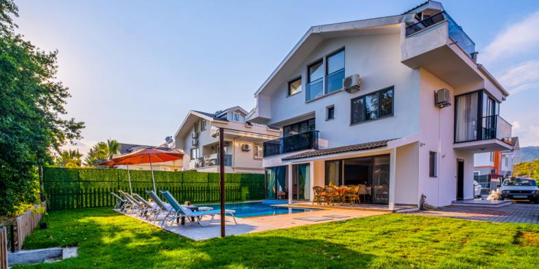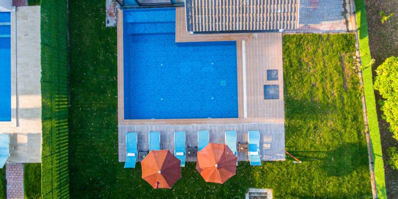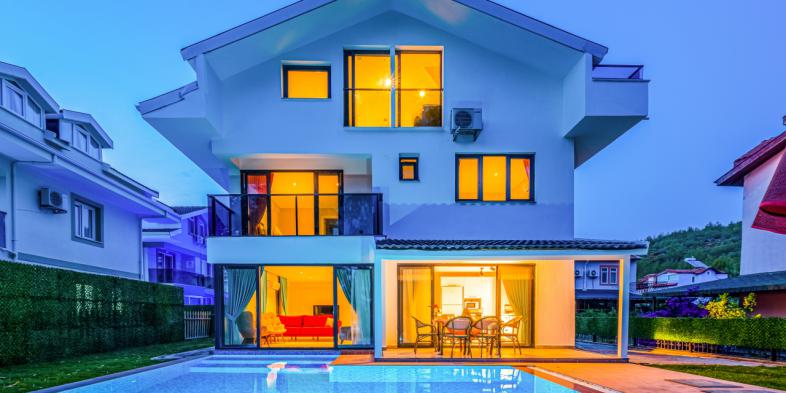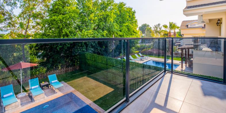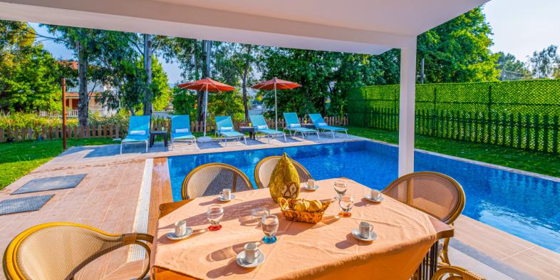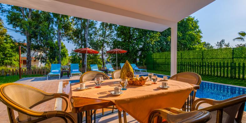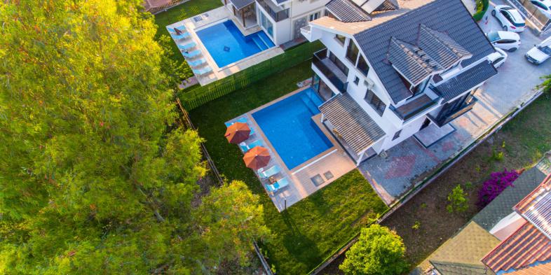 Our villa which is suitable for crowded families with its location in the lush nature, offers a wonderful holiday opportunity. In the evening you will experience a pleasant atmosphere both in and around the villas. Although they are isolated in an exclusive little enclave, the outdoor lightning creates harmony between the villas, making the area a lovely spot to go for a walk in the evening. You private pool will be lit at night.