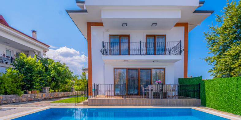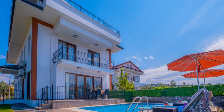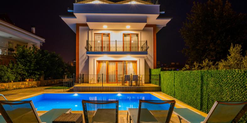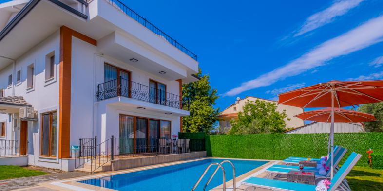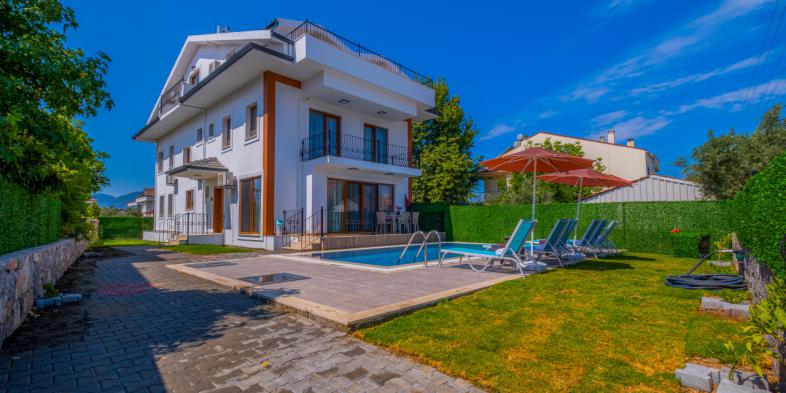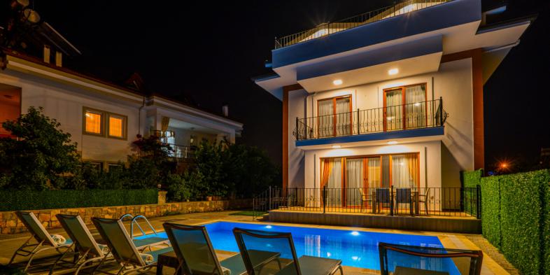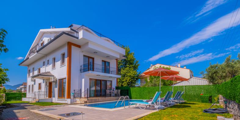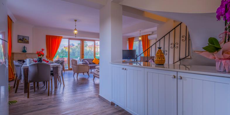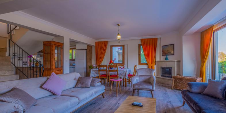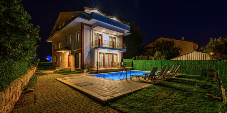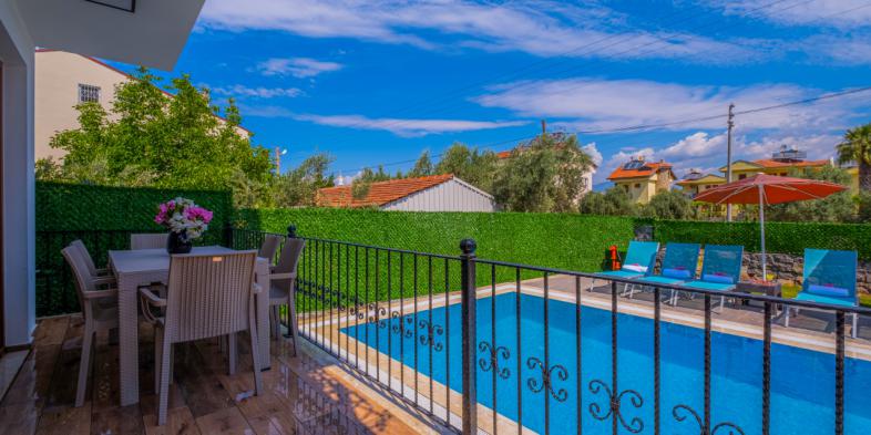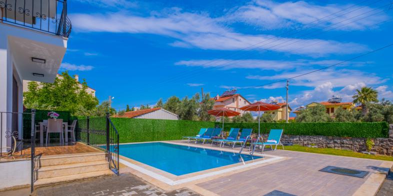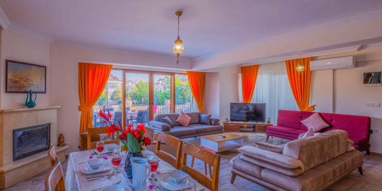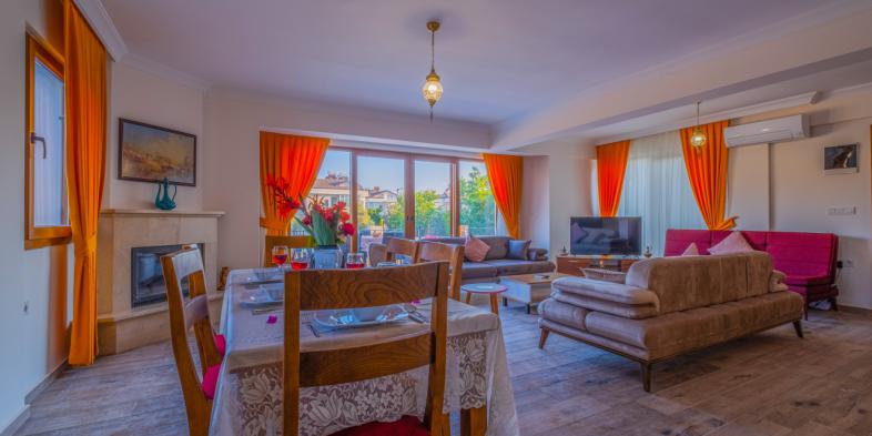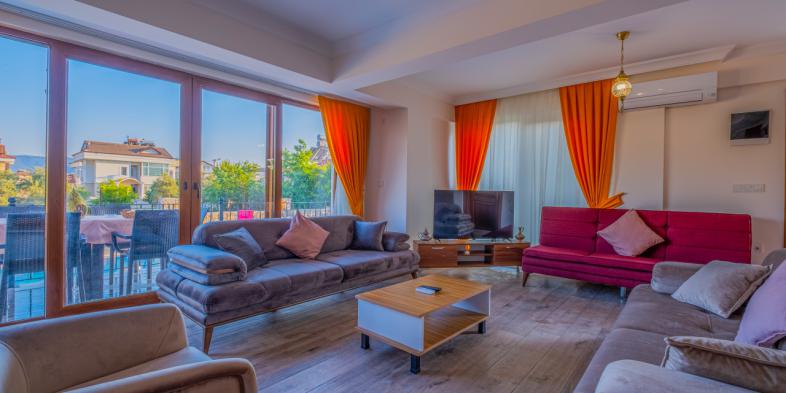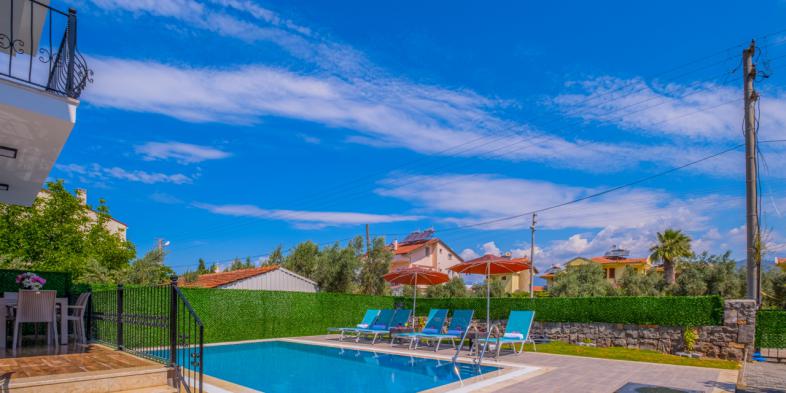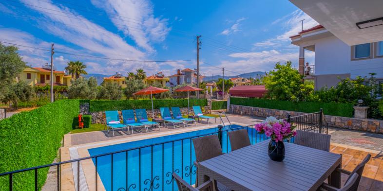 Myra Villa 1 is a spacious five bedroom, four bathroom villa. All bedrooms are air conditioned. It is suitable for family or friends sharing. The dining room leads out to the pool complete with extensive area. There is a seating area as well as a dining table for six. Lots of space, comfortable seating.This is the perfect place to watch the sunset and have that refreshing drink punch before dinner. The property has a well maintained garden. Myra Villa 1 is a great place to spend some relaxing days, taking in the sunshine. It is close to great restaurants, bars and night life Calis Beach.