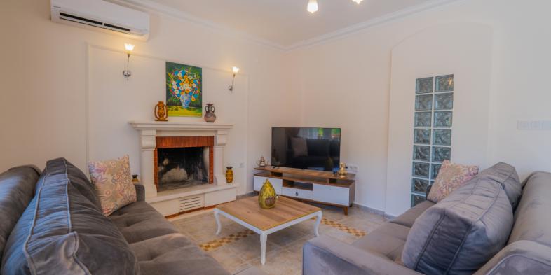 It has an open kitchen plan and has a lounge (living room). The living room has a fireplace, TV, sitting groups and a dining table.
