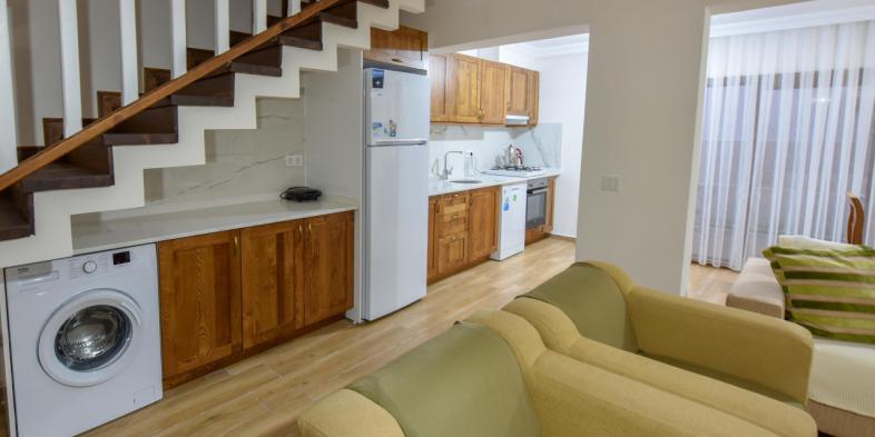 Açık mutfak planlıdır ve 1 adet büyük salonu (oturma odası) vardır.