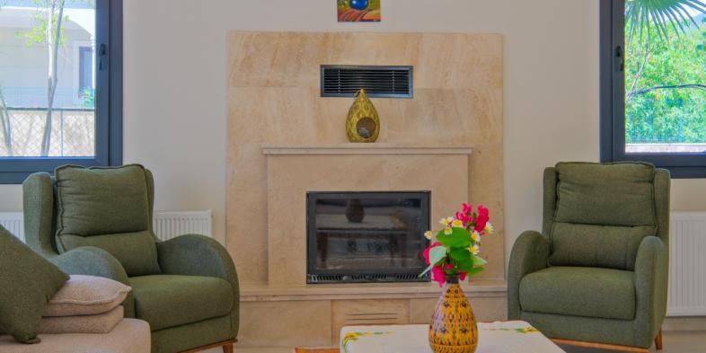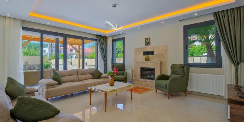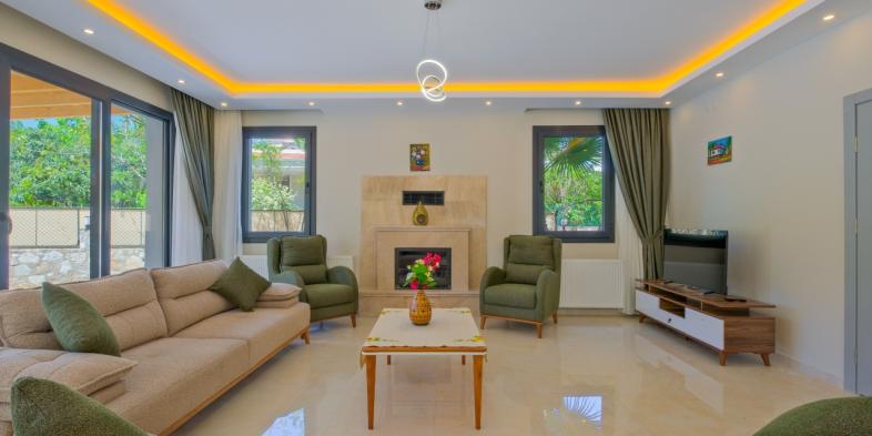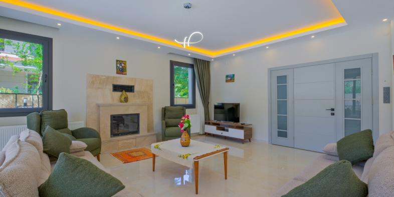 Şömine,oturma grubu,tv,tv sehpası,8 kişilik masa ve sandalyeleri
