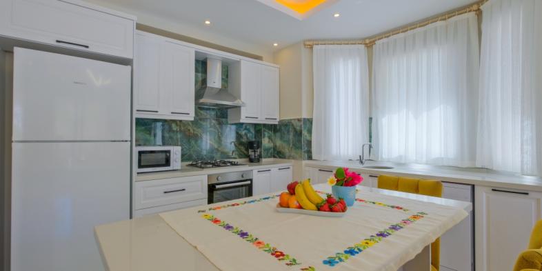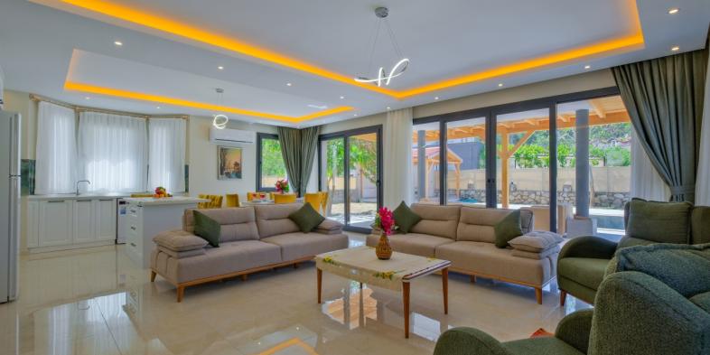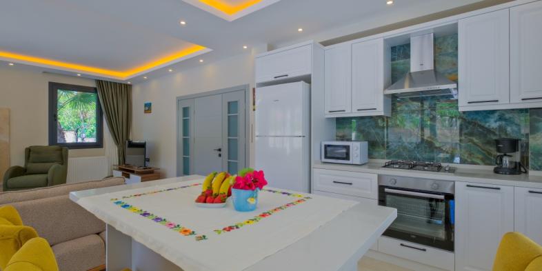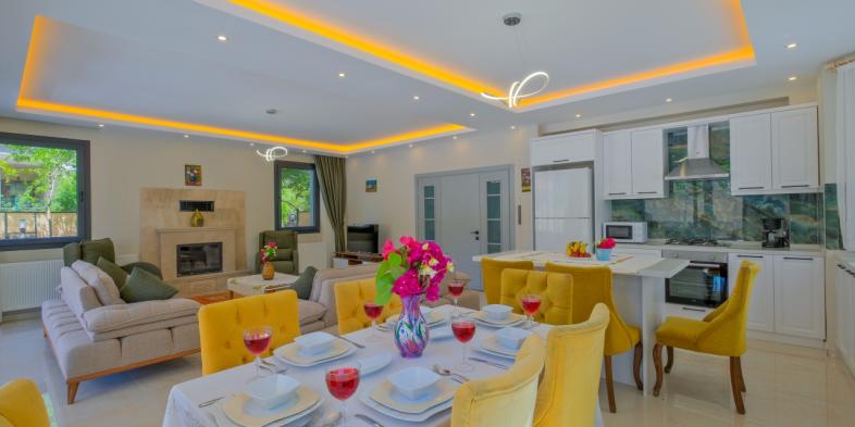 Açık mutfak planlıdır ve 1 adet şömineli büyük salon (oturma odası) vardır.