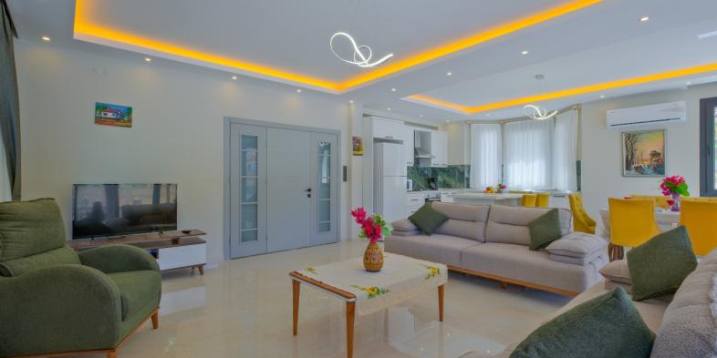 Salonunda 8 Kişilik yemek masası ve TV ile birlikte oturma grupları yer almaktadır.