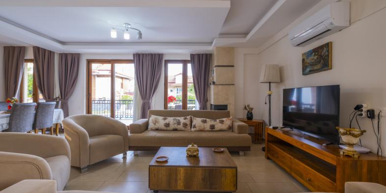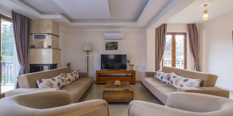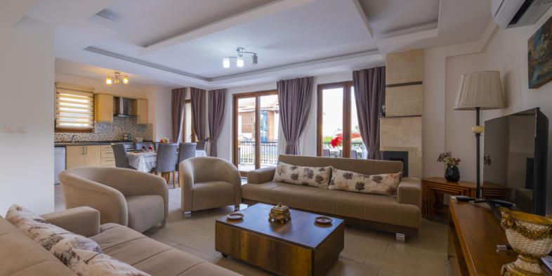 Şömine,oturma grubu,tv,tv sehpası,8 kişilik masa ve sandalyeleri