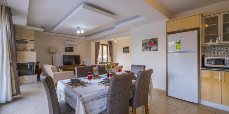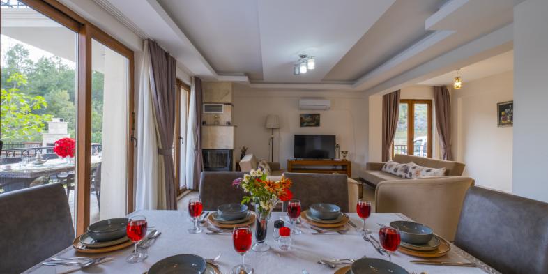 Salonda 8 Kişilik yemek masası ve TV ile birlikte oturma grupları yer almaktadır.